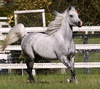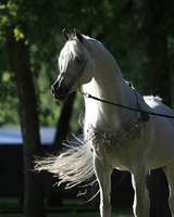 As each year passes and he matures more beautifully each one, Henry and I see this cross is working beyond what we ever imagined. Sahran is a blend of two breeding programs that of course originated with many others (Ansata and Gleannloch & St. Clair and of course the EAO) before Kehilan and Silver Maple Farm began. Sahran's pedigree pictorially is incredibly impressive and filled with great horses, whether stallions or mares, the lineage is a powerfully potent one. He brings his own spectacular traits to the breeding barn; a beautifully rounded body, super hip, movement, legs and feet along with powerful movement and a huge flag like tail waving away. Peronsality wise he is very bold and unafraid but then, why should he be afraid as he has never known a day of unkindness in his life. Whenever he is displayed at the farm he enjoys cruising very closely next to the rail to make eye contact with whomever is watching. We look forward to training him under saddle and seeing just what he is capable of doing. His first foal here in the USA was born June 25th to Danikah SMF (Ali Saroukh x Dance Diva by Raquin RA), a grey filly. His second foal is due now as well out of an Ansata Sinan Mare bred by Mitch Irwin and owned by A'ali Arabians of Bahrain. Well Nazeena foaled an exquisite colt, tall, very very stretchy with huge eyes and long, long legs. We wpormise photos soon!