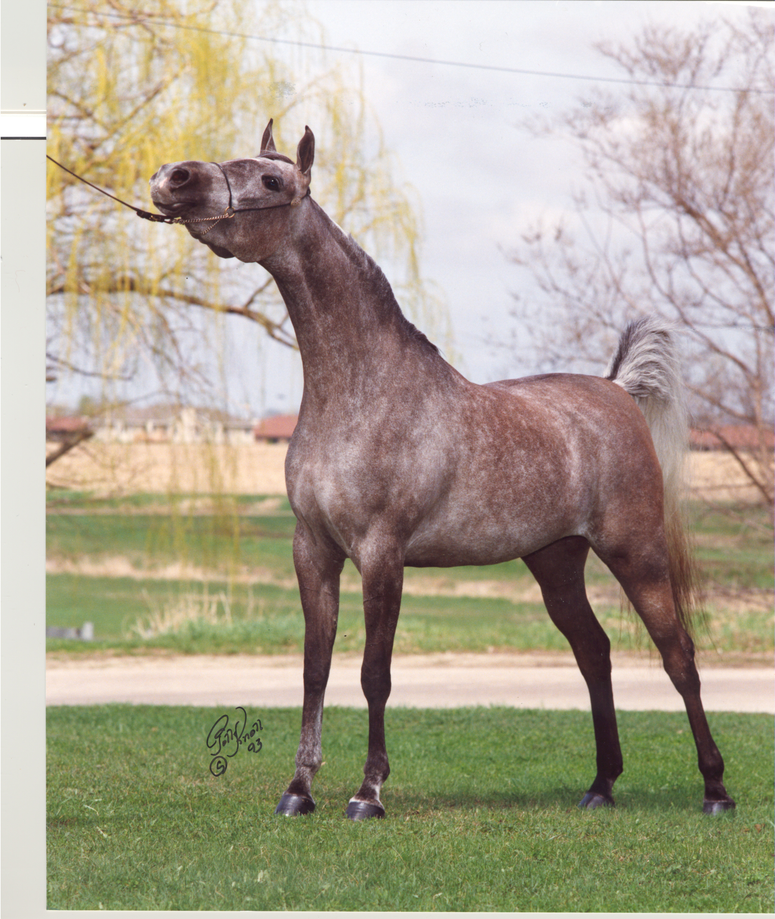 Sahbine was a lovely straight Egyptian mare out of our foundation mare Glorietasayonaara and sired by the world-famous stallion, Ruminaja Ali. Sayo was actually in foal with Sahbine when we purchased her from Judy and Charlie Jones, owners of Atallah Arabians. We watched her come into this world on February 2, 1990, one of the first foalings that we ever witnessed. Sahbine was special from the start and as she matured she exhibited many of the same qualities that I admired so much in her mother. She had the same regal character, the same lovely, dark eyes, wonderful movement and carriage.