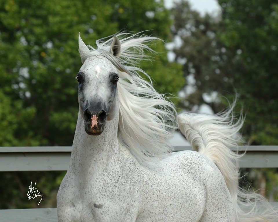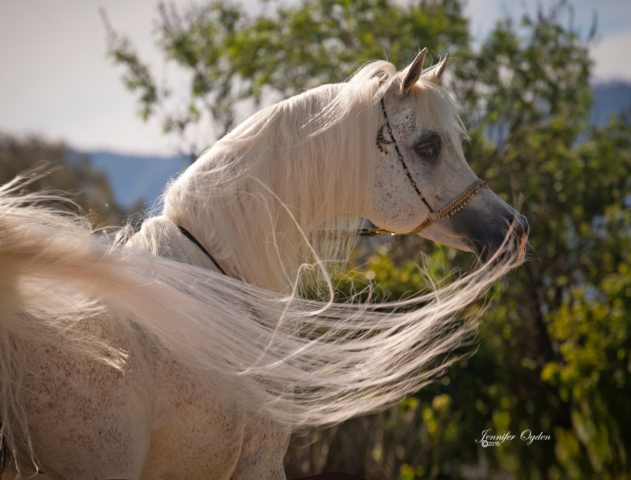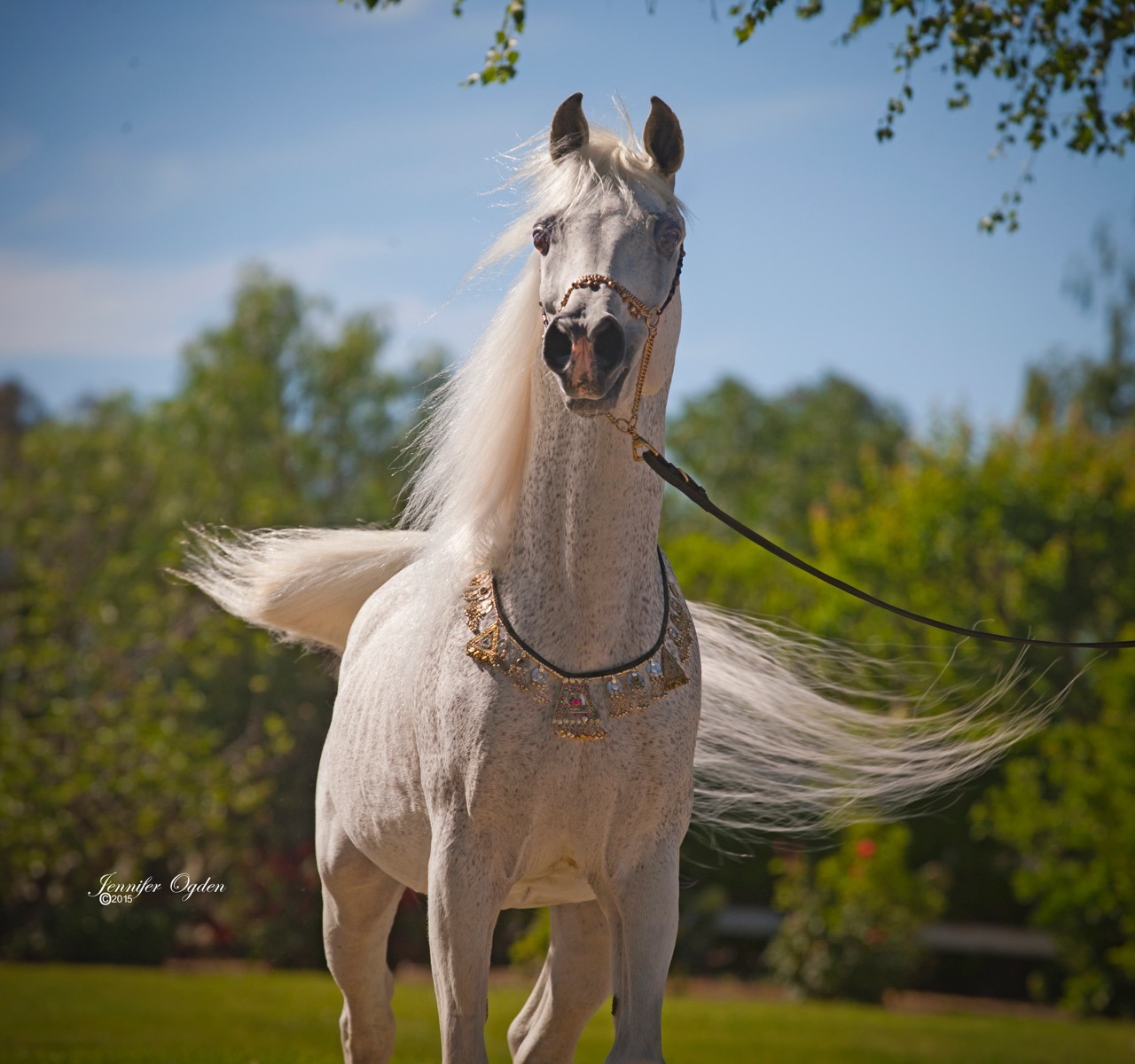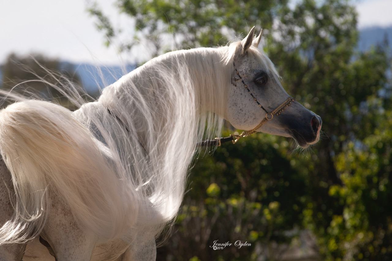 Sheikha Sara SMF a 2012 grey filly will carry forward through her pedigree three times the SMF foundation mare, Glorietasayonaara. This is important to us because she intensifies specific physical traits that we so cherish from this family such as elegance, high set necks with clean throat latches, large dark eyes, chiseled heads, floating movement and wonderful minds. Sheikha Sara also has the mare, Magidaa five times in her pedigree along with the mare Deena, two other powerhouse mare lines and significant dams in straight Egyptian pedigrees here in the United States. The Ali Saroukh daughter, Haalani SMF out of Ansata Haalah by Ansata Iemhotep has produced two very beautiful and exceptional bay fillies, one in 2012 (Hasna SMF) and another in 2013, (Al Bouraq Haana SMF) by Symbolic SMF (Majestic Noble SMF x Shaboura by PVA Kariim). Again, they typify the intense line breeding that for us at SMF produces huge dark eyes, exotic faces and amazing quality, traits that we cherish and continue to celebrate. Jade Lotus SMF (Ali Saroukh x Imdals Jade by Imperial Imdal) is a gorgeous and extremely charismatic daughter that has given us three foals; all of them exceptional and by three different stallions. Jasoor SMF by *Simeon Shai+, a four year old Junior stallion at SMF and the fillies Jada SMF a four year old Grey mare owned by Athala Arabians and a grey filly named Jewel SMF born in 2013 by Khaled KA, very tall and refined. For those of you that desire to add movement, large dark expressive eyes, tail carriage, a charisma plus marketable foals please consider a breeding to Ali Saroukh.